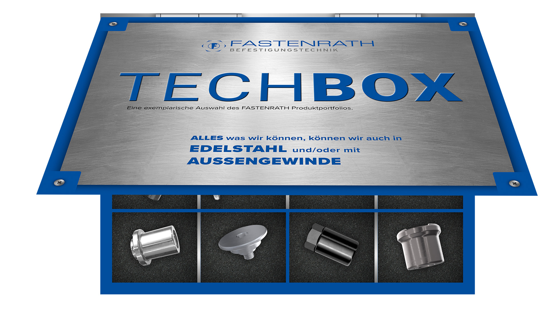 Bei FASTENRATH setzen wir auf Innovation – nicht nur in der Produktion, sondern auch in der Art und Weise, wie wir unsere Produkte präsentieren. Mit der FASTENRATH TechBox haben wir eine digitale Plattform entwickelt, auf der Sie unsere Befestigungslösungen hautnah erleben können. Die TechBox bietet Ihnen die Möglichkeit, sich eine repräsentative Auswahl unserer Produkte detailliert anzuschauen und die Qualität, Präzision und Vielfalt unserer Fertigungskompetenz interaktiv zu entdecken.