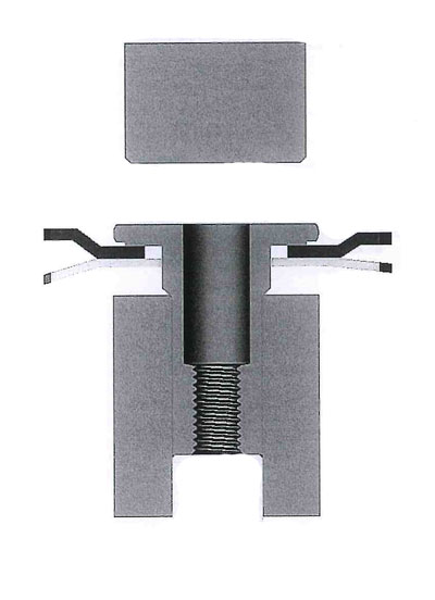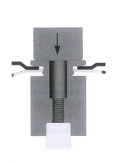 2. Ein Pressstempel drückt das twin-FAST® Bauteil in die Fließschabematrize, der Doppelflansch wird aufgestaucht.
